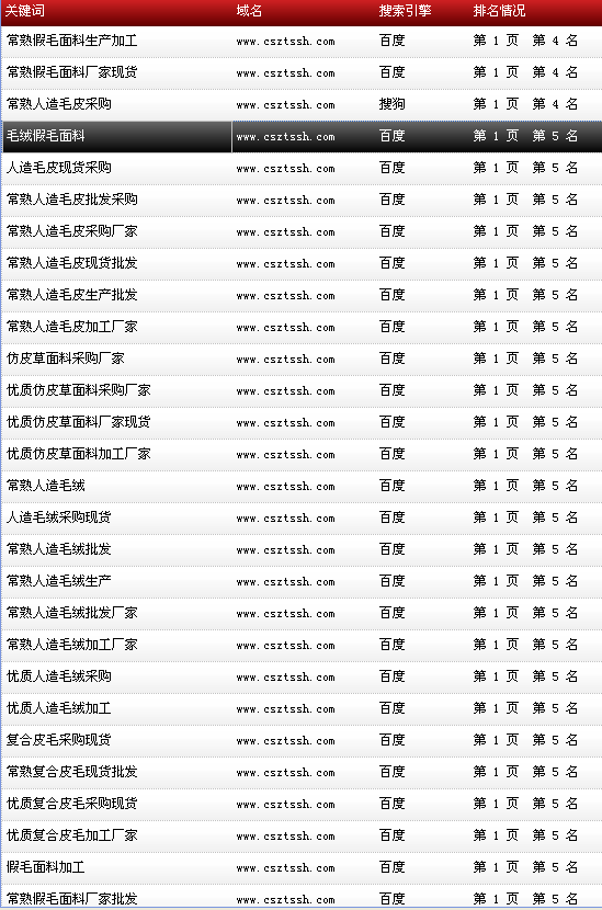 常熟市正太紡織有限公司是通科云盟蘇州代理商的客戶,該客戶是蘇州代理的老客戶,在蘇州代理的推薦下,采用了通科云盟推廣系統(tǒng),短短兩個(gè)月的時(shí)間,就有586個(gè)關(guān)鍵詞上了百度、搜狗、好搜(360)等搜索引擎的首頁,效果顯著,得到了客戶的肯定,表示會(huì)推薦更多的客戶使用我們的系統(tǒng)。以下是該客戶在各大搜索引擎的情況: